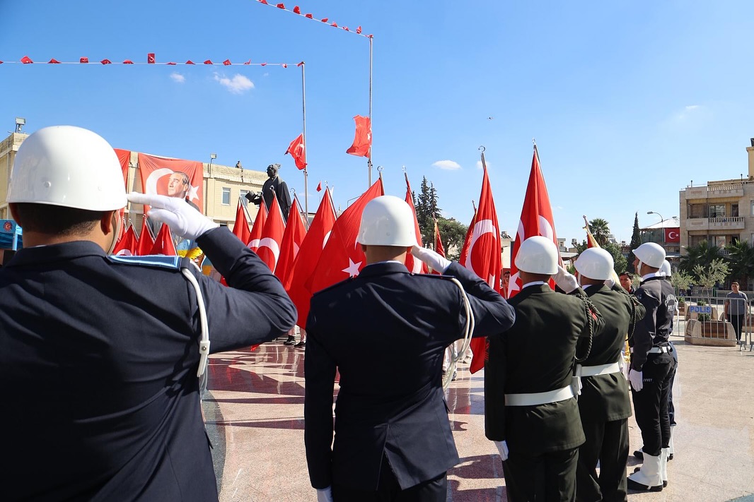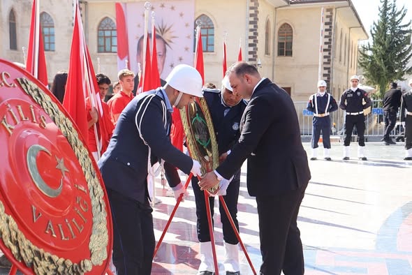 Kilis’te, 29 Ekim Cumhuriyet Bayramı’nın 102. yılı ve Gazi Mustafa Kemal Atatürk’ün Kilis’e gelişinin 107. yıl dönümü dolayısıyla çelenk sunma töreni düzenlendi.